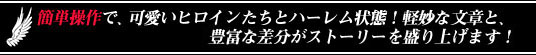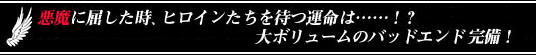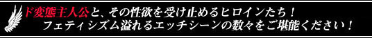 ![]() 「学園退魔!ホーリー×モーリー」には複雑なゲーム性や、煩雑なフラグ管理はありません。 簡単操作でヒロインたちとハーレム状態になり、エッチとラブイチャを思う存分楽しんでいただけます! 台詞主体で繰り広げられる日常シーンは、スラスラと読み進めることが出来ます。 そして豊富に用意された衣装差分と表情差分が、ゲームをさらに盛り上げます! ![]() ![]() ![]() ド変態主人公の、溢れんばかりの性欲。 時には仕方なく、そして時には積極的にそれを受け止めるヒロイン。 フェティシズム溢れるエッチシーンの数々をお楽しみいただけます! エロ下着でエッチ、コスプレエッチ、お風呂ブルマでエッチ、脇臭嗅ぎエッチ、 マイクロビキニ、競泳水着、メイドプレイ、痴漢プレイ、野外プレイ、アナルプレイ……。 あらゆるシチュエーションがあなたを待っています! ![]() ![]() ![]() 戦いの末、悪魔に屈してしまったヒロインたち……。 彼女たちを待つのは、恥辱の運命!! 悪魔たちの餌食となり、身も心も汚されていく様子を、大ボリュームでねっとりと描き出します! ※バッドルートを選択した時のみご覧になることができます。 通常ルートで、ヒロインたちが汚される展開はありません。 |